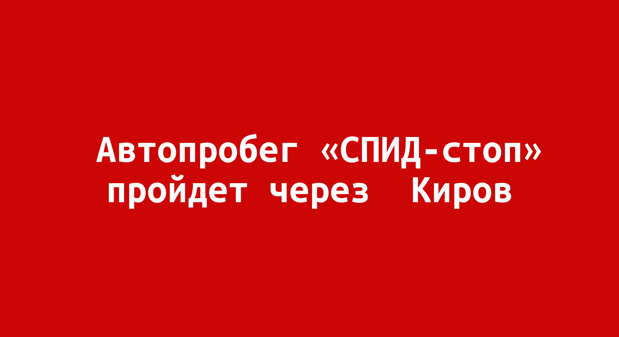 С 9 по 13 октября Всероссийский Автопробег «Спид-стоп» пройдёт через наш город. В рамках этого мероприятия в Кирове пройдут тренинги, круглые столы и лекции на тему профилактики ВИЧ. 13 октября в наш город приедут Влад Топалов, Юлия Чичерина и другие артисты, которые будут участвовать в гала-концерте. Он состоится на Театральной площади в 15:00. Тренинги по профилактике ВИЧ пройдут в 18 училищах и техникумах города. Также в Кирове эти дни состоятся съёмки передачи «СПИД. Скорая помощь» с известным ведущим Алексеем Лысенковым.
