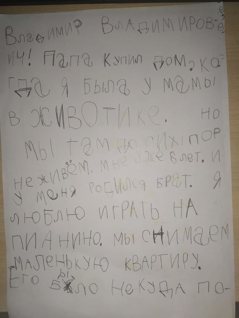 - Владимир Владимирович! Папа купил дом, когда я была у мамы в животике. Но мы там до сих пор не живем. Мне уже 6 лет. И у меня родился брат. Я люблю играть на пианино. Мы снимаем маленькую квартиру. Его было некуда поставить и отвезли к бабушке. Я играю редко.