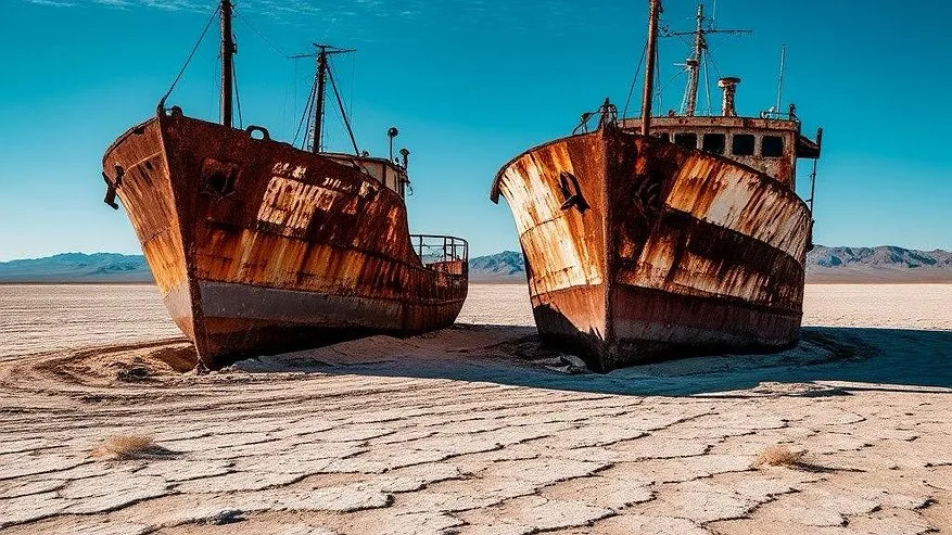В сердце Средней Азии раскинулась пустыня Аралкум — безжизненная, иссушенная земля площадью 38 тысяч квадратных километров. Здесь выживают только редкие растения и стойкие к засухе животные, а редкие водоёмы становятся настоящей роскошью для фауны. Но самое удивительное — заброшенные корабли, стоящие посреди песков, словно памятники ушедшей эпохи. Всего пятьдесят лет назад здесь плескались волны Аральского моря, некогда четвёртого по величине озера мира.