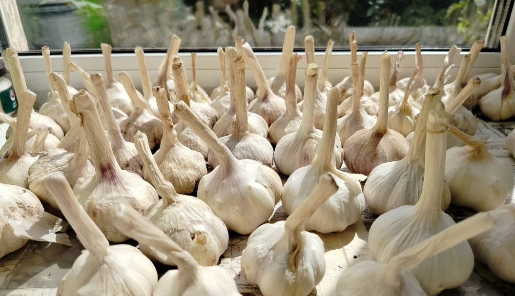 Если вы выращиваете чеснок самостоятельно, убирайте его в сухую погоду. После выкапывания разложите на просушку на 5-7 дней, затем досушивайте в проветриваемом помещении еще 2-3 недели. Перед закладкой на хранение обрежьте корни, оставив 1-2 мм, и стебли — до 2-15 см в зависимости от способа хранения. Отберите только твердые, здоровые головки без повреждений.