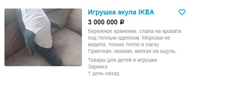 Люди стали перепродавать плюшевых акул Blåhaj за баснословные деньги. Например, в Алтайском крае предлагают приобрести "исчезающий вид" акул из "ИКЕИ" по цене 3 миллиона рублей.