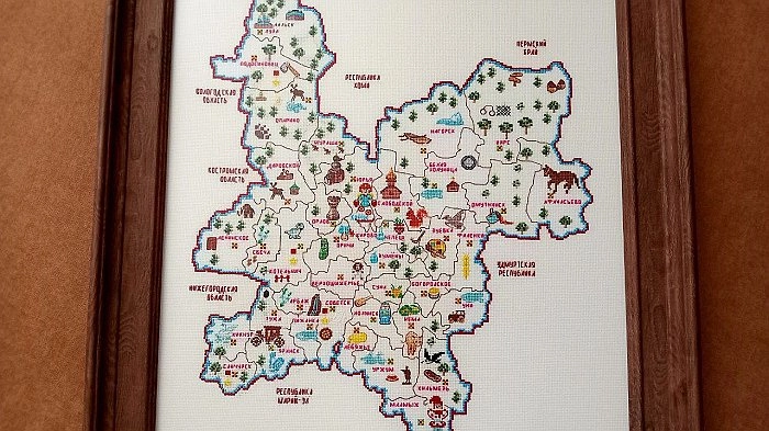 Жительницы Кировской области оформили необычную карту в виде картины, на ней обозначены все районы региона с указанием особых достопримечательностей или событий этих мест. Так, в Оричевском районе значком обозначен межрегиональный фестиваль «Истобенский огурец», в Зуевском районе – музей художников В.М. и А.М. Васнецовых в селе Рябово, а в Советском районе – Береснятский водопад.