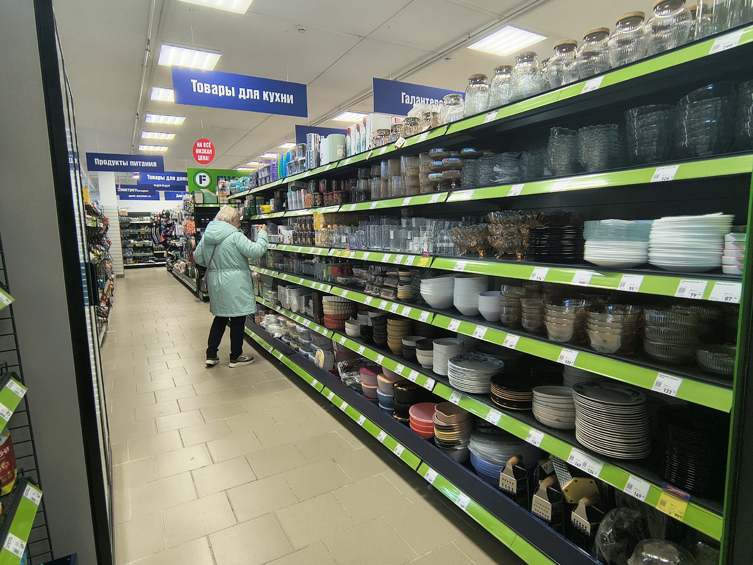 В отделе посуды особое внимание привлекли лаконичные кружки с белым глянцевым внутренним покрытием и легкой фактурой снаружи, напоминающей следы ручной работы. Есть варианты желтого, синего и голубого цветов. Для любителей менажниц в новой партии появились квадратные трехсекционные изделия, сменив старые круглые. Ручка закреплена надежно, а длина и состав указаны на этикетке.