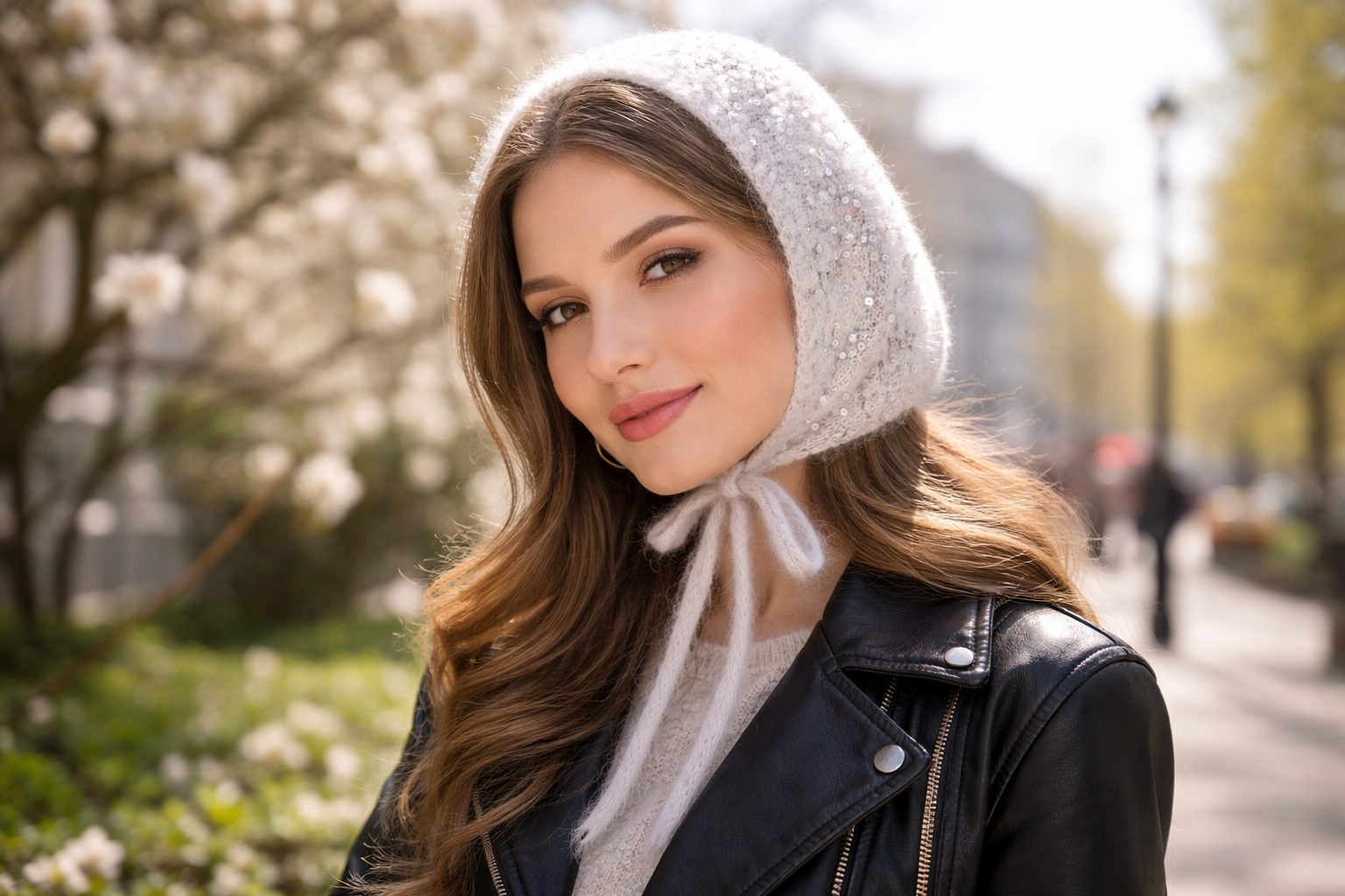 В числе заметных трендов — лёгкие вязаные чепчики из хлопка или мохера с деликатным блеском. Пайетки используются умеренно и дают мягкое мерцание, а не яркий глянец. Такие модели сочетают с тренчами, кожаными куртками и пальто прямого кроя. Ещё один актуальный вариант — свободный капор из тонкой пряжи. Он не прижимает волосы, сохраняет укладку и создаёт мягкий силуэт.