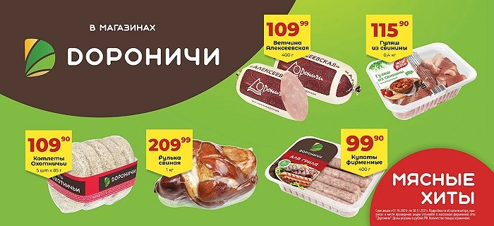 Срок акции с 01.10.2021г. по 30.11.2021г. Подробности об организаторе, правилах и месте проведения акции уточняйте в магазинах фирменной сети "Дороничи". Цены указаны в рублях РФ. Количество товара ограничено.