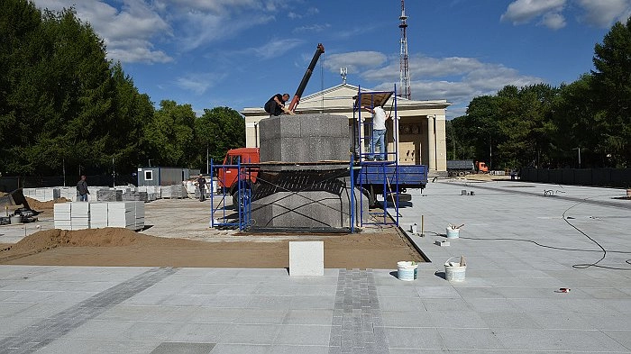 В настоящий момент основные работы по благоустройству практически закончены. Сейчас там идет укладка плитки из светлого гранита, проложены коммуникации для отведения воды и устройства наружного освещения.