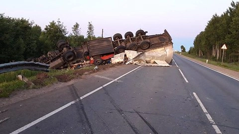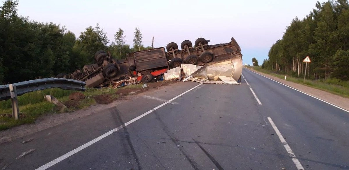 От удара легковой автомобиль получил серьёзные повреждения, а грузовик перевернулся и упал на дорожное ограждение.