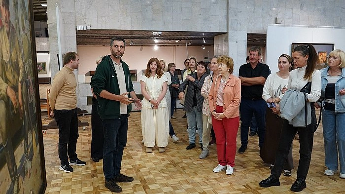 В рамках XX Всероссийского Васнецовского пленэра, Валерий Мокрушин, Василий Куракса и Сергей Трошин, участники мероприятия, провели ознакомительную экскурсию по экспозиции «Грековцы. Под знаменем Победы» (6+) в Вятском художественном музее. В ходе экскурсии они осветили ключевые моменты истории России, рассказали о важных битвах и представили портреты выдающихся военачальников и рядовых солдат.