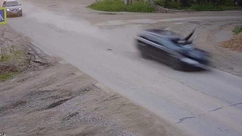 Можно заметить, что юноша в последний момент увидел автомобиль, но не успел перебежать дорогу