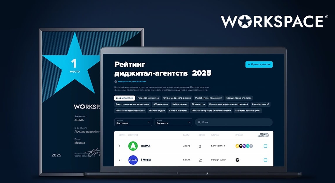 Workspace — современная digital-платформа, упрощающая поиск агентств для любых задач бизнеса. На площадке собраны каталоги цифровых (например, оказывающих услуги в сфере дизайна, видеопродакшна, веб-разработки, PR и CRM). Также в экосистему входят три блока рейтингов, широко известная премия Workspace Digital Awards, тендерный инструмент и собственное медиа, предоставляющее возможность самостоятельной публикации различных видов контента.